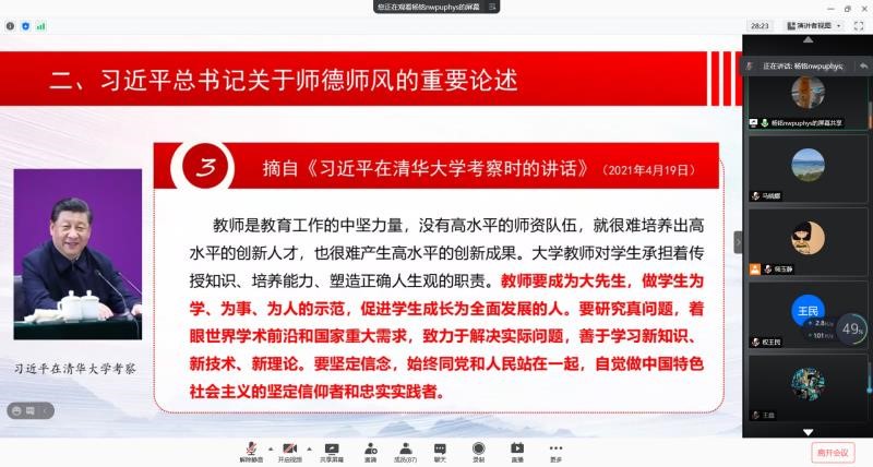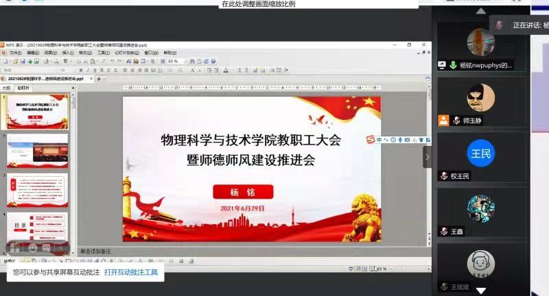 开展师德专题教育实施方案》等,进一步加强物理学院教职工师德师风建设,营造良好师德师风氛围,提升教师队伍整体素质。6月29日晚上,物理学院召开全体教职工大会暨师德师风建设推进会。学院全体教职工90余人参加会议,会议采用线上会议的方式召开,由学院党委书记杨铭主持。