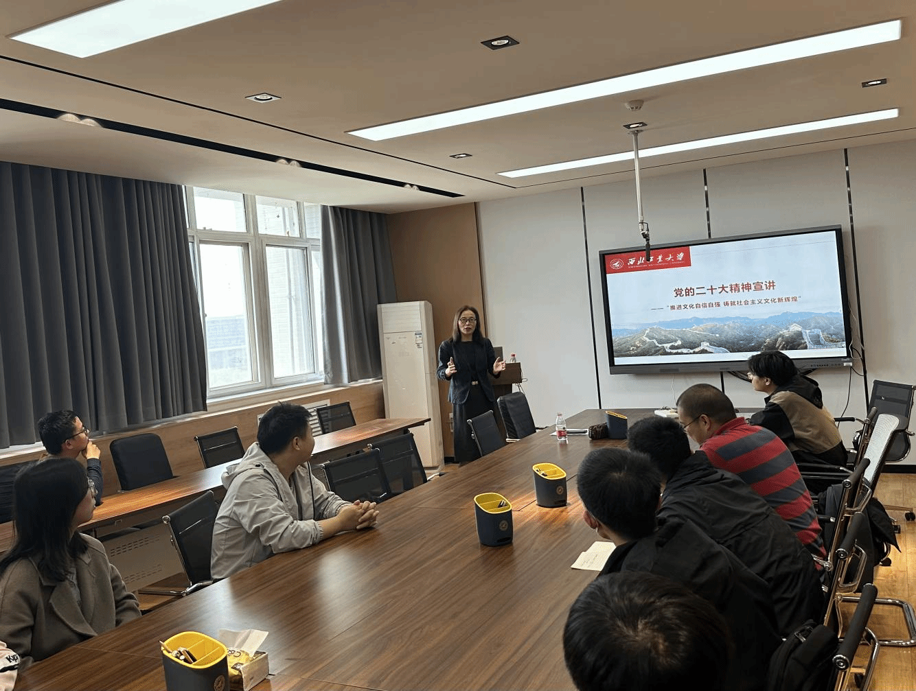 邀请马克思主义学院教师理论宣讲团成员蒲瑶教授讲授“推进文化自信自强,铸就社会主义文化新辉煌”专题思政课。学院党委委员、院长助理、党委组织员、各党支部书记及支委、学院部分教职工参加了本次思政课学习,思政课由学院党委委员宋坤主持。