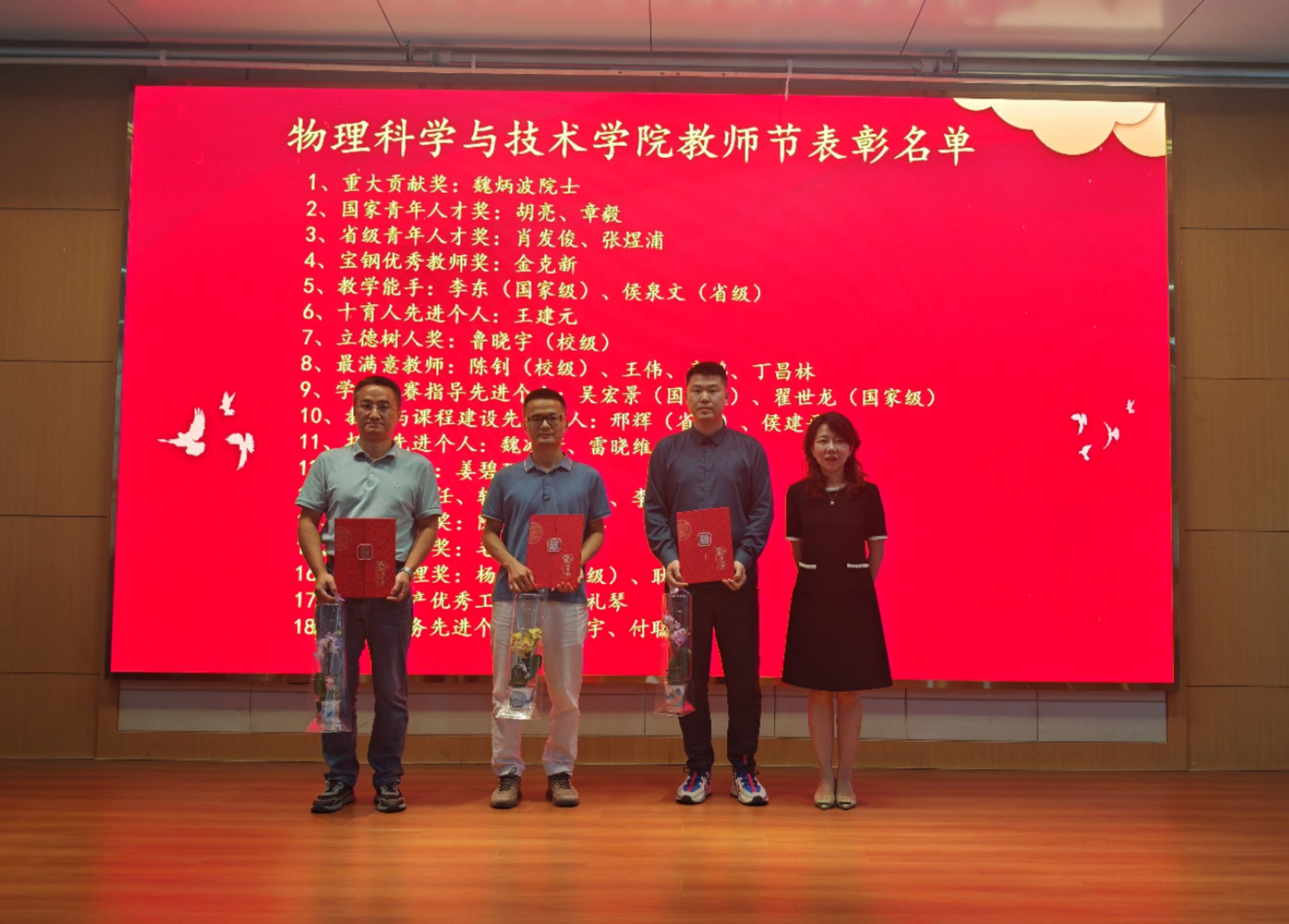 2023-2024学年优秀教师表彰名单,学院领导为胡亮、章毅、肖发俊等获奖教师颁发荣誉证书并合影留念。