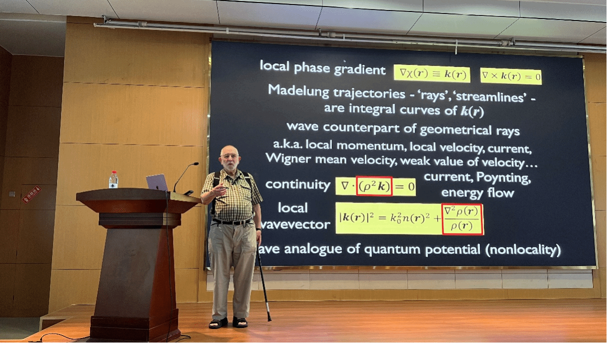 9月9日和9月11日上午,Berry教授分别以“Geometric phases old and new”和“Quantum trajectories, quantum potential, superoscillations: Madelung, de Broglie, Newton”为题作了两场学术报告,向大家介绍了几何相位两个世纪以来的发展史和量子轨迹、量子势、超振荡中的相位奇点、相位梯度、能流等数学和物理问题。9月11日晚,Berry教授与成人小说网