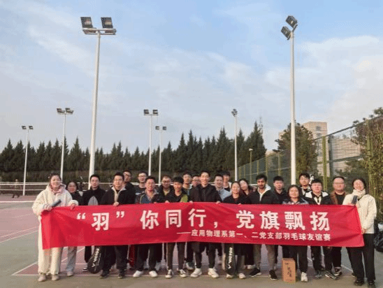 应用物理系第一、二党支部在体育馆羽毛球场成功举办了以“羽”你同行,党旗飘扬为主题的羽毛球友谊赛。