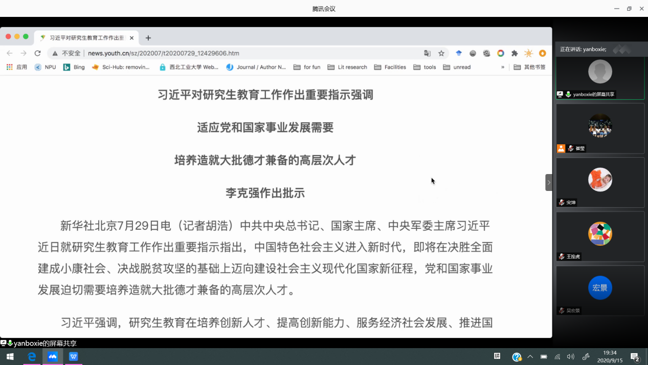 以腾讯会议的形式召开了专题会议,集中学习全国研究生教育会议精神。参与人员为相关研究生导师,会议由副院长谢彦博主持。