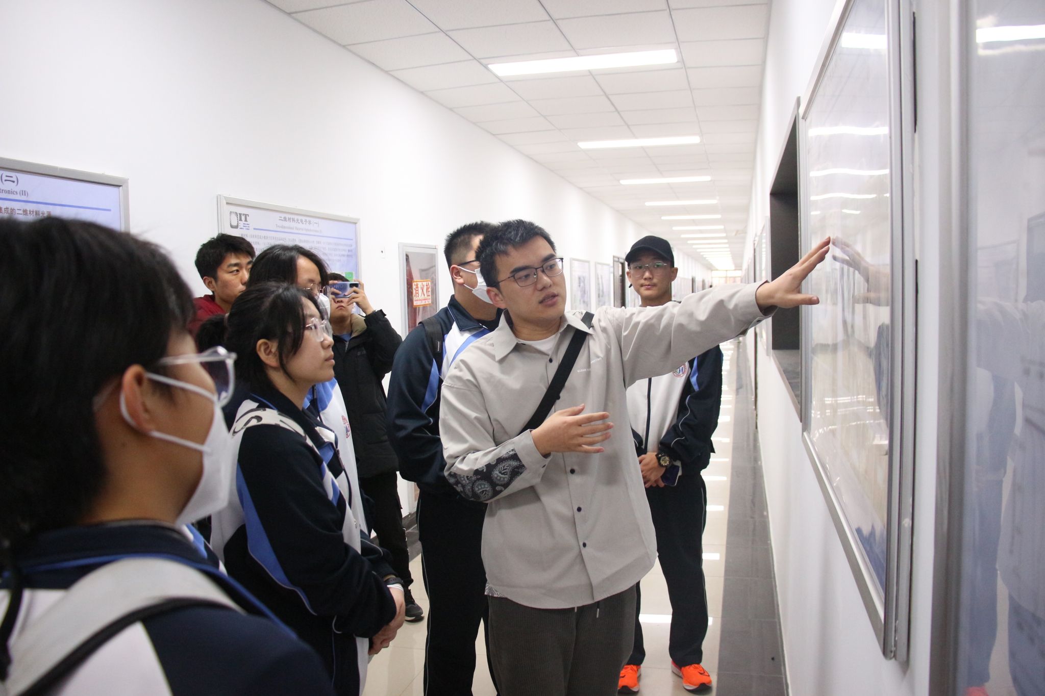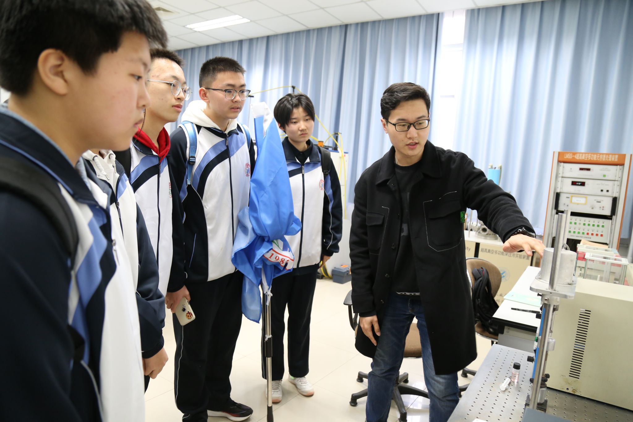 最后,在闫娜、李东、宋坤和杨超舜老师的带领下,研学师生分为三组轮流参观了陕西省空间材料科学与技术重点实验室、陕西省光信息技术重点实验室和陕西省凝聚态结构与性质重点实验室,并由各实验室负责博士生进行详细的解说。同学们对各种实验研究和仪器设备表现出浓厚的兴趣,踊跃提问,并不时记录。
