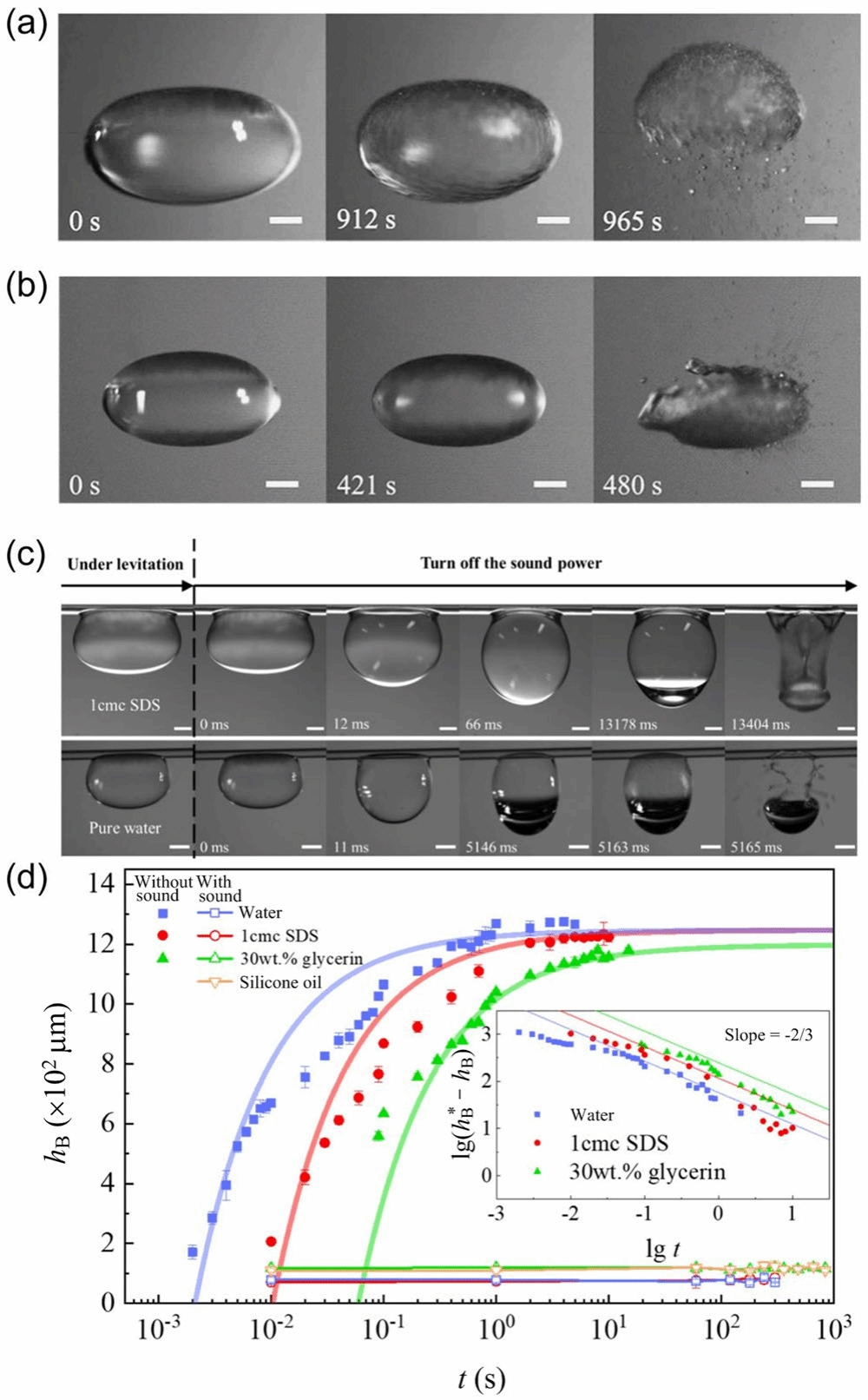 研究团队提出了利用超声场稳定气泡这一新方法,利用声腔共振机制形成了声悬浮气泡,发现其稳定性得到了显著提升。SDS气泡可以在超声环境下存在超过15min。即使没有任何表面活性剂的稳定作用,纯水气泡也可以稳定7min以上,这比常规气泡的寿命提高了两个数量级以上。此外,通过实验证明,在声场的稳定作用下气泡甚至能够在针刺等外部扰动下保持稳定。这种超稳定性是由于驻波声场在悬浮气泡的内外表面都提供了独特的声辐射压力分布,这样的声辐射压分布一方面平衡了液体重力,实现了稳定悬浮。另一方面对气泡膜提供了挤压作用,抵消了静水压力,从而抑制了其中的重力排液。该研究首创了通过超声悬浮稳定气泡的新方法,并进一步揭示了造成这种超稳定性的物理机制,并创立了“地面上最长寿命气泡”的吉尼斯世界纪录。这种无接触、无“污染”、超稳定的声悬浮气泡可以作为理想的生物/化学反应器,用于晶体生长、细胞培养的液体模板/独特的微环境,在材料工程、流体物理和生命科学等领域具有广阔的应用前景。