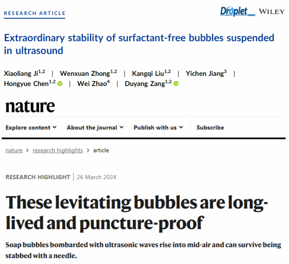 在气泡物理领域取得重要进展。研究成果以“Extraordinary stability of surfactant-free bubbles suspended in ultrasound”为题发表在国际知名学术期刊《Droplet》上(期刊封面故事),并被Nature亮点报道。论文第一作者为博士生姬晓亮,通讯作者为臧渡洋教授,本科生蒋一辰也参与了这项工作。论文链接。