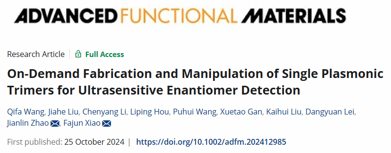 肖发俊教授、赵建林教授团队联合香港城市大学雷党愿教授、北京大学刘开辉教授在纳米科技领域顶级期刊《Advanced Functional Materials》发表了题为“On-Demand Fabrication and Manipulation of Single Plasmonic Trimers for Ultrasensitive Enantiomer Detection”的研究论文。成人小说网