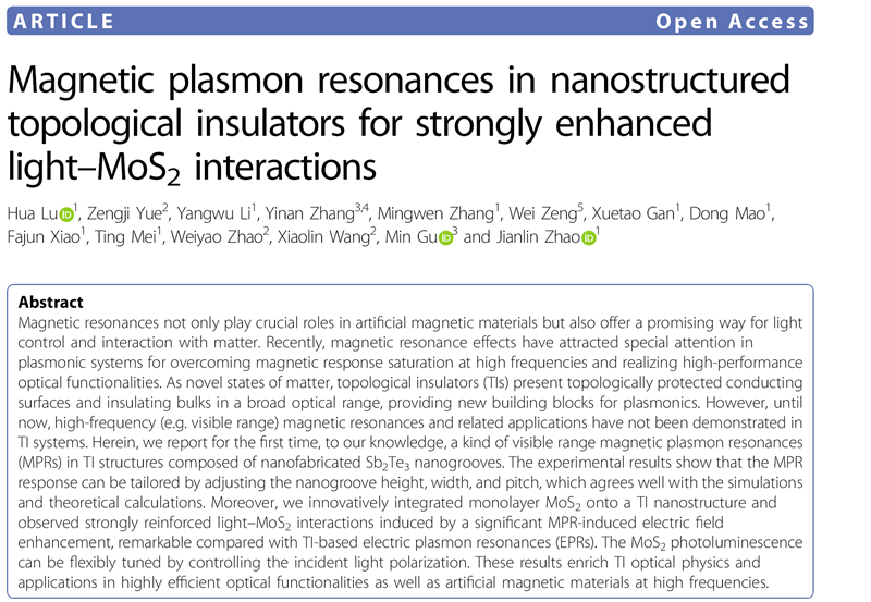 研究成果以“Magnetic plasmon resonances in nanostructured topological insulators for strongly enhanced light-MoS2interactions”为题,在国际光学顶尖期刊《Light: Science & Applications》上发表。论文第一作者为陆华副教授,通讯作者为赵建林教授、陆华副教授及上海理工大学张轶楠研究员。