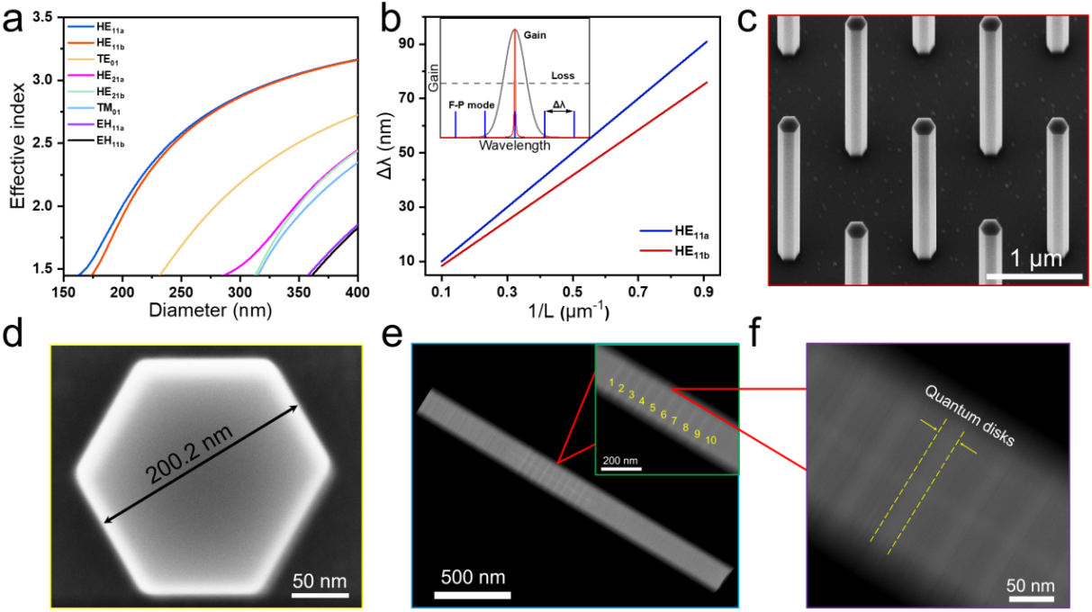 低功耗、易集成、纳米尺度的激光光源,在未来光信息处理相关的集成化光电子器件以及超分辨成像等领域具有重要应用前景,引起人们广泛研究。半导体纳米线的独特物性使其用于实现高性能、超紧凑纳米尺度激光器具有优势:一方面纳米线材料本身可作为提供高量子效率的增益介质,另一方面纳米线的两个端面间反射可构成法布里-珀罗腔。然而,已报道的纳米线激光器由于其物理尺寸较大,且折射率高,导致其增益光谱范围内出现多模激光输出,对其器件应用形成挑战。例如,在光通信中,多模输出会导致脉冲时域展宽和模间串扰,限制通信带宽。
