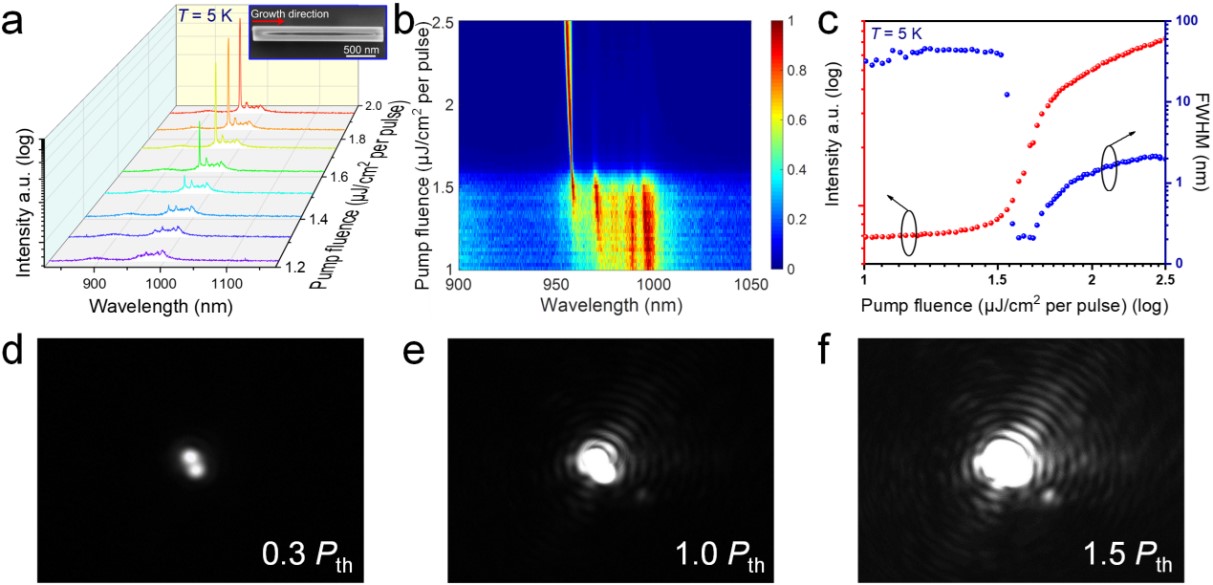 研究团队首先通过数值模型,辅助设计单模纳米线激光器几何结构参数(见图1)。通过减小纳米线直径,限制其所能支持的横模数目;通过减小纳米线长度,增大纵模间距,使其增益光谱范围内仅支持单个模式。另外,为了解决纳米线激光器由于物理尺寸减小而引起的阈值增大问题,研究团队利用有机金属化学气相沉积选区外延技术(SA-MOCVD),可控制备了镓化砷/铟镓砷量子盘纳米线,其规整的形貌、含多个量子盘,保证了低光学损耗和高材料增益。如图2所示,在5 K条件下,利用直径200 nm、长度2.2 μm的纳米线(为已报道纳米线激光器的最小尺寸)实现了低阈值(Pth= 1.6 μJ/cm2)、窄线宽(0.15 nm,Q= 6400),近红外波段(959 nm)的单模输出。